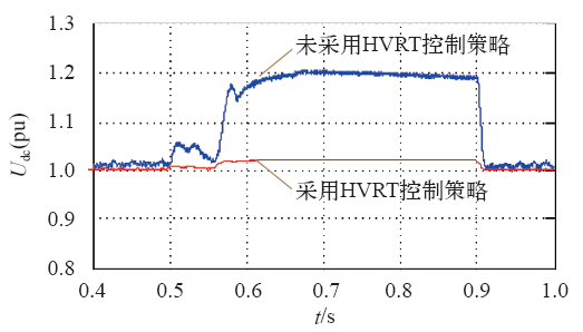 由式(3)可知,当电网电压升高时,直流母线电压也将随之升高。由式(4)可知,当电网电压骤升时,电网侧功率无法正常送出,功率由电网侧流入变流器,导致直流母线电压升高,直接威胁变流器的正常运行。因此为保证电网电压骤升期间风力发电机组的正常运行,需采取有效的高电压穿越控制策略。