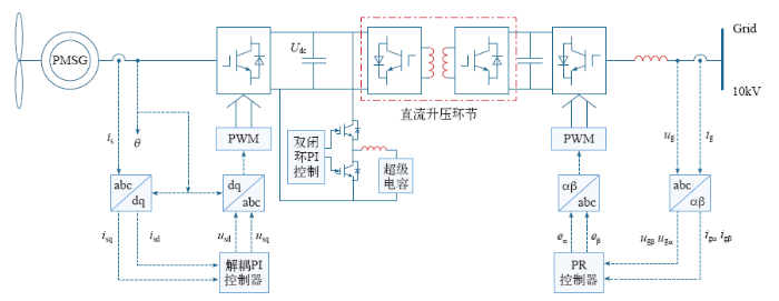 本文将PR控制器引入到永磁同步发电系统网侧变流器的电流调节中,提出一种基于比例谐振(Proportional Resonant,PR)的永磁直驱风电机组的高电压穿越控制策略。在电网电压骤升时,改变网侧工作状态,使风力发电机组快速向电网提供感性无功。在直流母线电压超出限值时,超级电容器储存多余的电网能量以维持直流母线电压恒定,使PMSG具备高电压穿越的能力。文中采用一种基于固态变压器的永磁直驱风电并网系统对所提控制策略进行验证[14]。