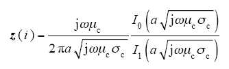 式中,μc和σc分别为导体i的磁导率和电导率;a为圆柱导体的半径;I0和I1分别为修正的第一类零阶和一阶贝塞尔函数。
