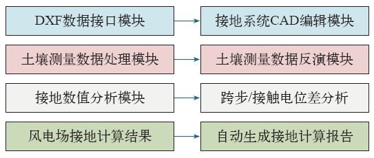 风电场接地辅助设计软件架构如图3所示。按软件的设计思路,软件分为DXF风电场接地系统CAD数据导入模块、前处理模块(风电场土壤电阻率测试数据处理和反演模块、接地数值计算模块(接地电阻计算、地表电位/跨步电位差/接触电位差分析模块、降阻方案分析)和后处理模块(地表电位/跨步电位差/接触电位差可视化、接地计算结果综合和报告自动生成)。