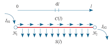 图1中支路l连接2个节点N1和N2,流入和流出节点的电流分别为IN1和IN2。支路上微元dl上导通电流和散流电流分别为C(l)和S(l)。在接地参数分析中,均匀土壤为半无限大各向同性的媒质,一般采用导电率或电阻率来表示其性能。接地系统的局部范围与交流50Hz或60Hz工频电流的透入深度相比要小得多,因此可以忽略传播时间,在交流或直流情况下接地系统特性可以基于恒定电流场理论进行分析。如果电流流入埋设在地中的接地装置,根据恒定电流场理论,以无限远点为参考点,应用格林函数的原理可以得到电极泄流电流在任意一点p产生的电位Vp为