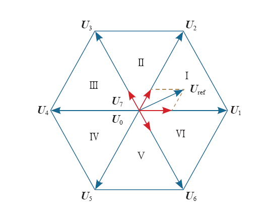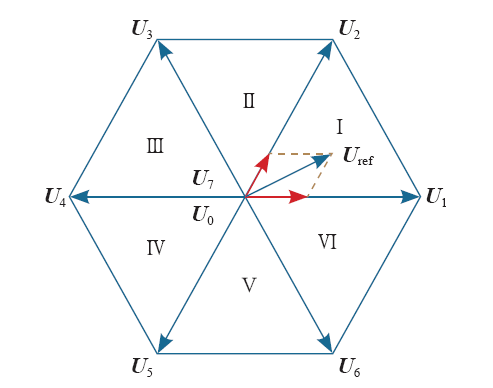 NSPWM的基本原理是使用与参考矢量距离最近的3个非零矢量对其进行合成,空间矢量分布图如图6所示。