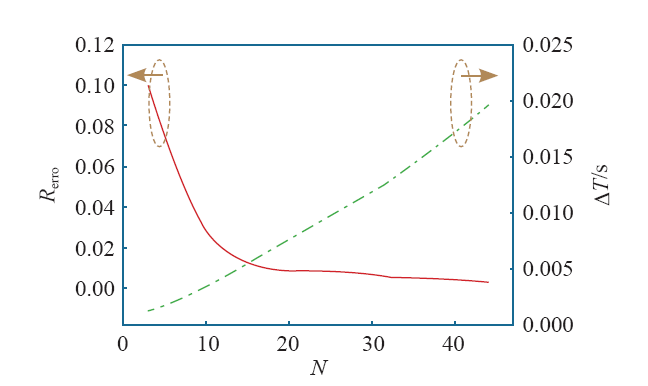 双小波检测中的关键是基波信息提取的精确性和暂降时刻检测的准确性,消失矩阶数表征小波函数逼近信号的收敛率,是小波分析的重要参数,本文选用db系小波函数作为研究对象,分别研究基波信息提取的精确度和暂降信息检测的准确度与消失矩阶数N的关系,为双小波检测中小波函数的选取提供支撑。以220V含30%电压暂降的工频信号为例,暂降检测的准确度和基波检测精度分别用偏离时间ΔT和误差率Rerro来表征,即