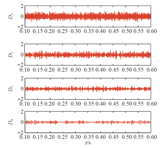 图5为谐波在小波各尺度的传播特性。不同于噪声和暂降信号,各次谐波分布在指定高频频段中。3次谐波主要分布在D4频段中,13次谐波主要分布在D2频段中,基波信息分布在A4频段中。