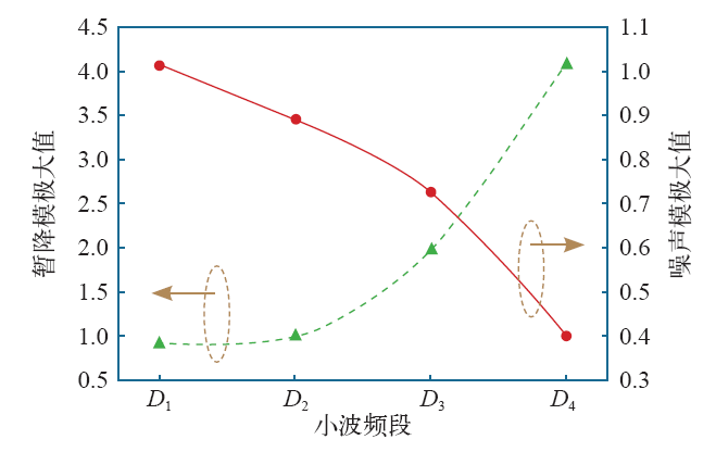 图4为噪声在小波各尺度的传播特性。可以看出,噪声作为干扰信号随机分布在小波变换的各个高频尺度上,噪声模值呈现负奇异特性,即在高频频段上较大,随尺度的增加逐渐减小,在低频频段上基本不存在。