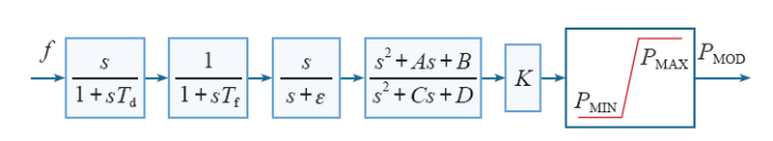直流功率调制器结构如图3所示。其中,s/(1 + sTd)为微分环节,当微分时间常数Td很小时,近似为微分器,该环节的主要作用是提取信号中的变化趋势,以得到较好的动态控制效果,Td越大,输出量的相位超前量越小,影响阻尼效果,但Td值太小,则不能准确反映实际测量回路中无法避免的时间滞后。经综合考虑,计算中取Td范围为0.1~1s。1/(1 +sTf)和s/(s + ε)为低通滤波和高通滤波组合的带通滤波,可以在满足某个固定频率或频带上幅值最大,而在其他频带上被尽量滤除,其中Tf为滤波器时间常数,ε为引导补偿因子。(s2 + As + B)/(s2 + Cs + D)为陷波滤波器,其中A、B、C、D为陷波滤波器参数,工程应用中一般不参与控制作用,取A = B = C = D。K为调制增益;PMIN为设定的直流功率与功率调制量下限之和;PMAX为设定的直流功率与功率调制量上限之和;PMOD为输出功率调制信号。
