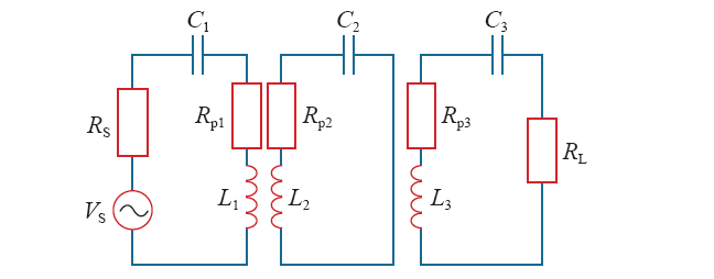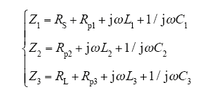 图中,VS为系统的高频功率源;RS为高频功率源的内阻;Rp1、Rp2、Rp3分别是发射线圈、中继线圈、接收线圈损耗电阻,因为辐射电阻要远远小于损耗电阻,故本文忽略线圈的辐射电阻;C1、C2、C3分别为对应线圈的等效电容;L1、L2、L3分别为对应线圈的等效电感;RL为线圈的负载电阻;f0为系统谐振频率;L1与L2之间互感为M12,L2与L3之间互感为M23。同时为了方便计算,本文忽略发射线圈和接收线圈之间的互感。