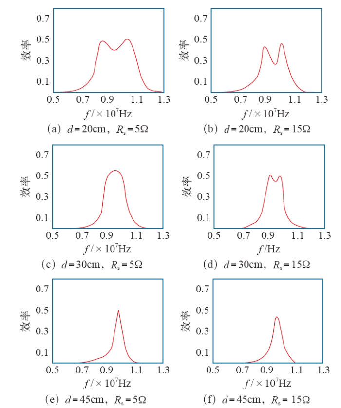 式中,μ0为自由空间磁导率;N2、N3为中继线圈和接收线圈的匝数;r2、r3为中继线圈和接收线圈的半径;d23为它们之间的距离。下面分析磁耦合谐振式无线输电系统的频率分裂现象。该系统的工作区域根据实际耦合系数与临界耦合系数的关系可以分为欠耦合、临界耦合和过耦合,但频率分裂现象仅出现在过耦合区域。由式(8)和图2可以看出,在三线圈自身参数(匝数、半径等)不变的情况下,谐振线圈之间的耦合系数k23与它们之间的距离成反比。在过耦合区域,随着中继线圈和接收线圈之间距离d23的减小,谐振线圈之间的耦合程度逐渐增大,频率分裂现象也变得越来越明显;而随着距离d23的增大,谐振线圈之间的耦合程度逐渐减小,频率分裂的两个分支也慢慢汇合直到汇聚到f0点,f0点为临界耦合点,在该点能够实现能量的最大传输效率。临界耦合点是欠耦合状态和过耦合状态的过渡点。欠耦合状态下,仍然能够进行无线电能传输,但是可实现的能量传输效率是有限的。由于发生频率分裂现象时,系统有不止一个谐振点并且每个谐振点都能取到传输效率的极大值,因此有必要采取措施来抑制频率分裂现象。在分析抑制频率分裂的方法之前,先来看一下图3,该图是对相同内阻不同距离下系统效率的比较以及相同距离不同内阻下系统效率的比较。图3是由表1的相关数据以及式(7)仿真得到,其中3a和3b距离为20cm,内阻RS分别为5Ω、15Ω;3c和3d距离为30cm,内阻RS分别为5Ω、15Ω;3e和3f距离为45cm,内阻RS分别为5Ω、15Ω。
