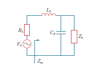 下面首先对添加了阻抗匹配的系统进行理论分析。根据最大功率传输原则,谐振状态下,发送端的阻抗匹配网络的输入阻抗Zin的实部等于源线圈内阻RS而虚部等于0。设WPT除发送端阻抗匹配电路之外的等效阻抗为Z0,如图5所示,得到等效阻抗为
