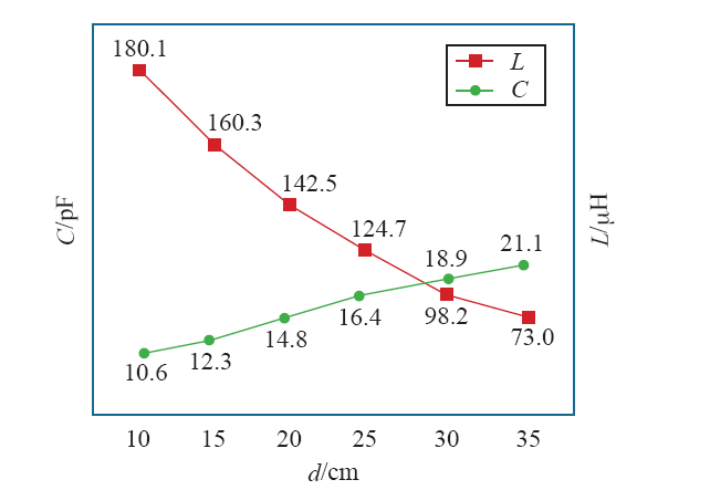 以上分析了添加阻抗匹配网络之后WPT系统匹配电容、匹配电感以及输入阻抗输出阻抗的关系式。而对于整个WPT系统来说,在添加阻抗匹配网络后,既要满足输入阻抗与内阻共轭匹配,又要满足输出阻抗与负载共轭匹配,才可在抑制频率分裂现象的同时提高WPT系统的效率。对于源线圈添加的阻抗匹配网络,主要任务是找到匹配电容和电感的值;对于接收端的匹配网络,主要任务是找到耦合系数的值。而它们均受距离因素影响,因此距离是影响本文所提阻抗匹配系统的关键因素。下面本文通过实验和仿真验证所提阻抗匹配方法的正确性。