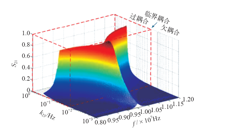 | 图2 三线圈WPT系统S参数、耦合系数、频率的关系 |