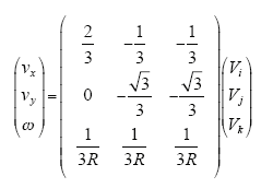 在平台坐标系中,平台沿两个坐标轴方向的线速度为vx、vy,vx、vy、ω与Vi、Vj、Vk之间的关系式为