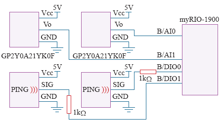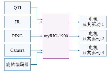 传统的里程计方法采用电机编码器和陀螺仪等惯性传感器,存在误差积累。误差消除型里程计系统采用NI公司的myRIO-1900型控制器,在传统里程计定位系统的基础上,硬件上增加超声波、红外测距传感器,控制软件中增加位姿校准子程序,定期对移动平台的位姿进行校准,将安装精度与轮子与地面接触不连续等原因造成的累计误差清零,之后继续完成预定任务。系统硬件结构如图3所示。