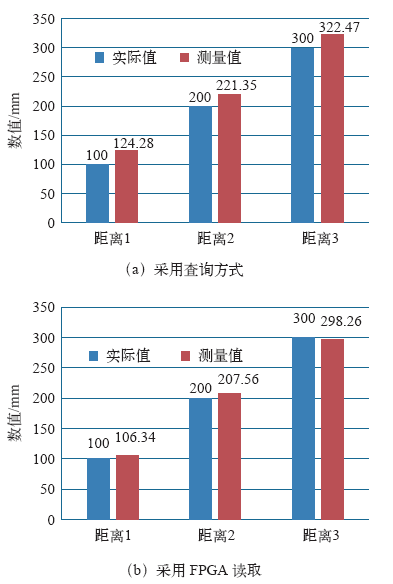 取100mm、200mm、300mm三个实际距离,标记为距离1、距离2、距离3,全向移动平台采用“Analog input”VI读取红外传感器数据,得到三个测量数据,与对应实际距离进行对比,如图11a所示,测量数据偏差范围为12.36~15.21mm,波动为2.85mm;对测量数据进行均值滤波后,与对应实际距离进行对比,如图11b所示,测量数据偏差范围为9.23~10.54mm,波动为1.31mm。可见,均值滤波后,偏差基本恒定,数据波动减小。在平台位置校准中进行偏差修正,测量误差为±0.66mm。myRIO-1900型控制器的IO口数据由FPGA采集,依然取100mm、200mm、300mm三个实际距离,标记为距离1、距离2、距离3,LabVIEW实时模块(LabVIEW Real-Time,RT)查询访问FPGA时,测量值与实际值对比如图12a所示,测量数据偏差范围为21.35~24.28mm,波动为2.93mm;FPGA直接读取IO口数据时,测量值与实际值对比如图12b所示,测量数据偏差范围为6.34~8.26mm,波动为1.92mm。可见,FPGA直接读取IO口数据时,测量数值与实际值的偏差明显减小,数据波动减小,进行偏差修正和均值滤波后,测量误差为±0.96mm。RT查询访问FPGA时,测量值波动大,且与实际值偏差大的原因是超声波传感器的触发与读取时间长,引起数字信号的丢失和延迟。将基于上述算法的红外传感器与超声波传感器应用于全向移动平台,让平台进行多次向前直线运动10m,测试数据显示:平台在前行过程中,运行10m平均累计误差为±50mm,在移动平台目标管理任务中,该误差尚可以接受。为了移动平台执行目标管理任务时更精准,让全向移动平台沿着如图13所示的路径前行,并在A、B、C、D、E五点进行移动平台姿态校准与误差清零,将移动平台位姿误差与实际行进距离关系绘成曲线,如图14所示。观察移动平台位姿误差值与实际行进距离之间的关系曲线,发现曲线分为四段,每段曲线随着移动平台前行,位置误差不断积累;第三段曲线累计误差最大,达到22mm,为平台最大误差;在A、B、C、D点移动平台进行误差清零;标红的部分误差有阶跃现象,是因为移动平台转弯,轮子与地面发生打滑所致。
