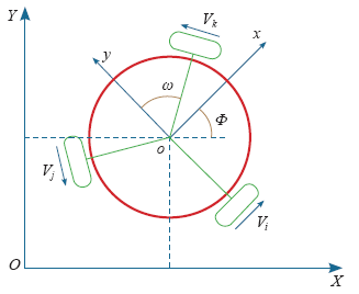 移动平台的运动学简化模型如图2所示,XOY为世界坐标系,xoy为平台坐标系,两坐标系间的夹角为Φ,3个轮子分别标记为i、j、k,线速度标记为Vi、Vj、Vk,平台旋转的角速度为ω,轮子到平台中心点O的距离为R。