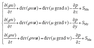 动量守恒定律也是任何流动必须满足的基本定律,按照这个定律,可推导出x、y和z三个方向上的动量守恒方程为