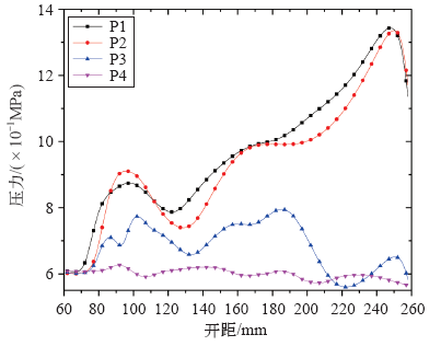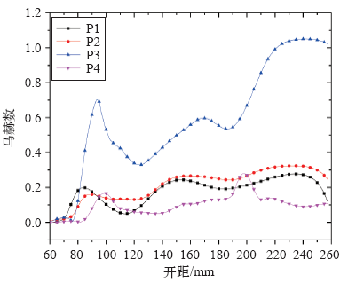 通过对计算结果的比较,得到气流马赫数与速度分布一致,图3为灭弧室内P1~P4采样点处马赫数随开距变化曲线。分析可知:90mm开距前,由于喷口堵塞,气流量较少,少量气流经喷口喉部间隙进入下游,大部分气体在上游积聚,灭弧室内P1、P2、P4点气流马赫数较小,P3点位于喷口喉部间隙处,只有有限气流向喷口下游扩散且速度较大,但气流从压气缸流出并流入断口间马赫数均较低,而由于拉伐尔喷口“收–放”作用,使流过喉部的气流速度增大,马赫数随之增大,此时大部分气流由于喷口的堵塞由辅助喷管侧流出,因为辅助喷管通道顺畅,所以流过气体速度逐步增大,马赫数也较大。