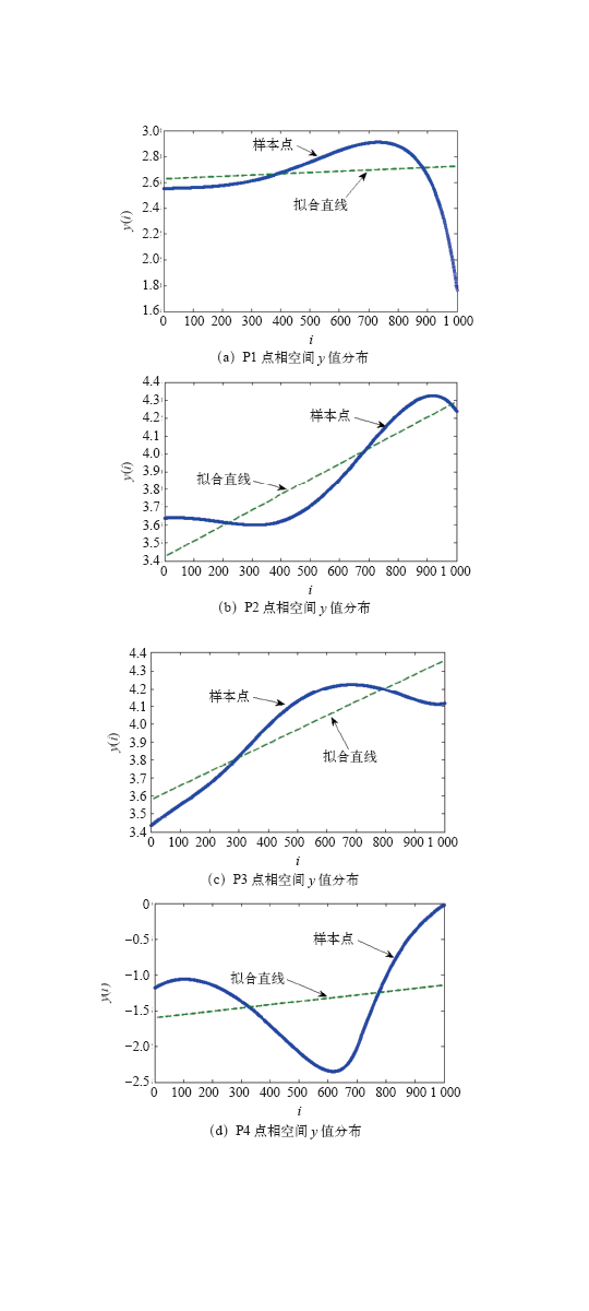 如图6所示,各图分别为P1~P4压力时间序列的最大Lyapunov指数,其中曲线是压力数值进行3次样条插值后得到的基本样本点,拟合直线斜率即为最大Lyapunov指数。