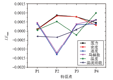对于温度和湍流动能,P3点的温度和P2点的湍流动能较低,气流运动剧烈程度较低,同时P4点处温度、湍流动能的LEmax均大于0且湍流动能LEmax值整体呈上升趋势,表明此处湍流从源头到喷口下游的混沌行为发展充分,直接反映出喷口结构对于冷气流湍流现象产生以及混沌效应具有直接影响。这与马赫数和速度反应的结论相同,论证了整个结论的正确性。