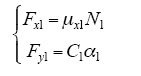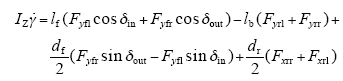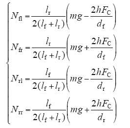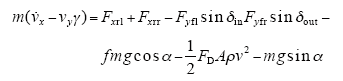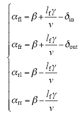式中,m为整车质量;vx、vy分别是整车纵向、侧向的速度;v为整车车速,且$$v=\sqrt{v_{x}^{2}+v_{y}^{2}} \qquad$$;Fx、Fy分别为车轮所受的纵向力和横向力;δin、δout分别为前轮内、外转向角;f为车轮滚动阻力系数;g为重力加速度;α为车辆爬坡角;FD为空气阻力系数;A为车辆迎风面积;ρ为空气密度;lf和lb分别为汽车质心到前后轴的距离;df和dr为前后轴车轮轮距;IZ为车辆的转动惯量;γ为横摆角速度。