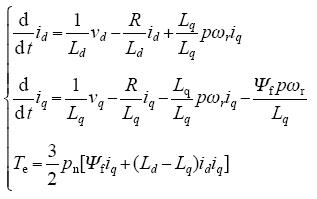 式中,Ld、Lq分别为定子绕组交、直轴电感;R为定子绕组的电阻;id、iq分别为交、直轴电流;vd、vq分别为交、直轴电压;ωr为转子的角速度;Ψf为磁链;pn为磁极对数;Te为电磁转矩。