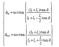 式中,L为两主销线中心延长线到地面交点之间的距离。汽车在良好的路况上行驶时,正常转向此时车轮不发生滑动,四个车轮的角速度相对整车中心点相等,设角速度为ω0,前后轴的转弯半径是方向盘转角和轴距的函数[5],即