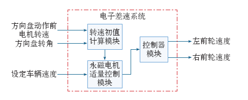 电子差速通过接收驾驶者发出的指令,由控制器作用于永磁电机进而来改变车轮的速度,实现整车的转向。也即通过模拟电压以及位移传感器来实施整个指令。本文采用前置驱动方式,即前面两个车轮作为驱动轮和转向轮,后面两个车轮作为从动轮。只需对前面两个车轮进行速度控制来实现差速。