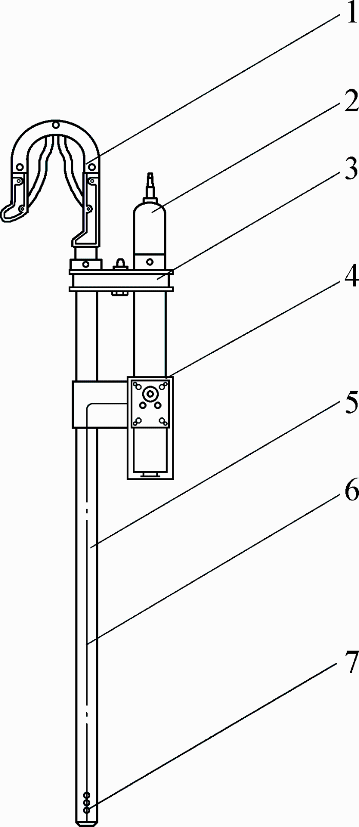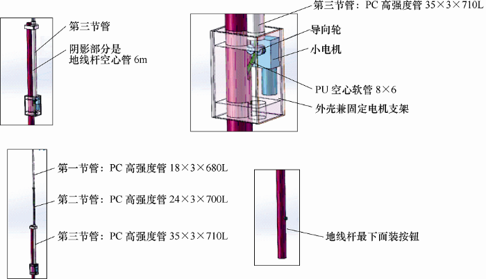 综合考虑质量、绝缘和价格等因素,三节伸缩杆均采用PC高强度管,第一节管长度为0.68 m,外径35 mm,内径29 mm;第二节管长度为0.7 m,外径24 mm,内径18 mm;第三节管长度为0.71 m,外径18 mm,内径12 mm。