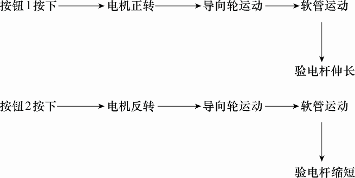 如图3所示,在进行验电杆伸缩时,首先按钮给单片机信号,单片机控制电机正转提供动力,使导向轮旋转运动,带动软管直线运动,验电杆伸长。同理,当电机反转时,验电杆缩回。