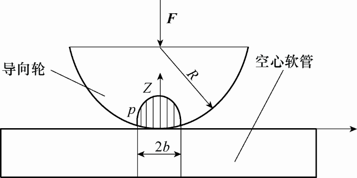 根据赫兹接触理论可得,当导向轮与空心软管接触时,由于二者的接触部分为线面接触,所以受力后接触面形状为矩形,而且该接触面的压应力分布为一个半椭圆体,如图5所示。设矩形的长度为L,宽度为2b,图中F为外部载荷,R为导向轮半径。