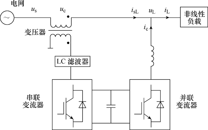 UPQC的基本拓扑结构如图1 所示。其主要由变压器、串联变流器及LC滤波器、直流母线电容器、并联变流器及其输出滤波电感器等部分组成。串联变流器通过变压器接入电网,主要功能是补偿电网电压的电能质量问题,如电压谐波和电压波动等;并联变流器通过输出滤波电感器直接并联在负载侧,主要功能是补偿负载电流的电能质量问题,如谐波电流和无功电流等。