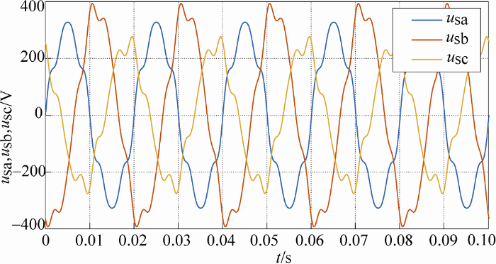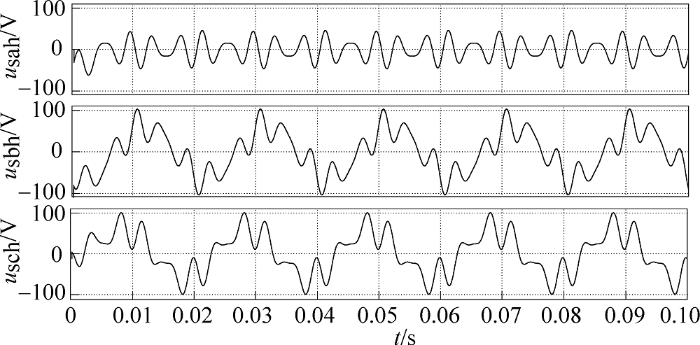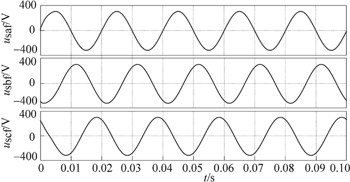 式中,u sa 、u sb 、u sc 分别为电网a、b、c相电压;V 为电压幅值;$\theta $为电压分量初相角;下标s为电网侧电量;n 为谐波次数。其中,+、-、0分别表示正序、负序和零序分量。
