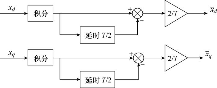 由于三相电压、电流中的基波分量对应于dq 坐标系下的直流分量,谐波分量对应于交流分量,而交流分量在一个交流周期内的平均值为零,因此采用式(11)平均值滤波法可滤除交流分量,从而获取与基波分量所对应的直流分量。