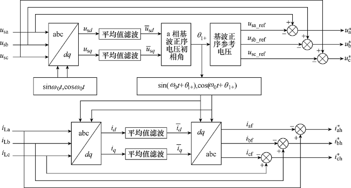 最后,将实际电网电压与所得基波正序参考电压作差即可得到电压补偿量。同时,将检测所得的电网基波正序电压的相位信息作为电流检测的相位基准,电流检测中采用改进dq 检测法,实现电压、电流的统一检测,最终检测出电压、电流补偿量。