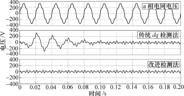 a相电网电压和分别采用传统dq 检测法、改进检测法得到的补偿电压