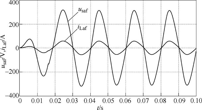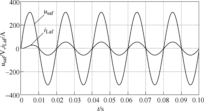 (17) $\left\{ \begin{align} {{u}_{\text{sa }\!\!\_\!\!\text{ ref}}}=220\sqrt{2}\sin (\omega t+{{\theta }_{\text{1}+}}) \\ {{u}_{\text{sb }\!\!\_\!\!\text{ ref}}}=220\sqrt{2}\sin (\omega t+{{\theta }_{\text{1}+}}-120{}^\circ ) \\ {{u}_{\text{sc }\!\!\_\!\!\text{ ref}}}=220\sqrt{2}\sin (\omega t+{{\theta }_{\text{1}+}}+120{}^\circ ) \\ \end{align} \right.$