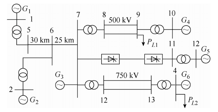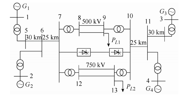 本文采用改进后的四机两区域、六机四区域系统仿真模型。该模型当中,直流输电系统额定输送容量为1 000 MW,整流侧额定电压为345 kV,基波阻抗值为$47.665\angle 84.25^{\circ}$,三次谐波阻抗值为$142.3\angle 84.73^{\circ}$,逆变侧额定电压为230 kV,基波阻抗为$21.2\angle 75^{\circ}$,三次谐波阻抗为$412.97\angle 69.7^{\circ}$,750 kV输电系统升压变压器容量为1 000 MVA,送端系统输送功率P1,500 kV系统输送有功功率Pac1,750 kV系统输送有功功率Pac2,当输送距离为S=300 km时,稳态参数如表1所示。当直流系统在4 s时发生单极闭锁故障,系统故障参数如表2所示。