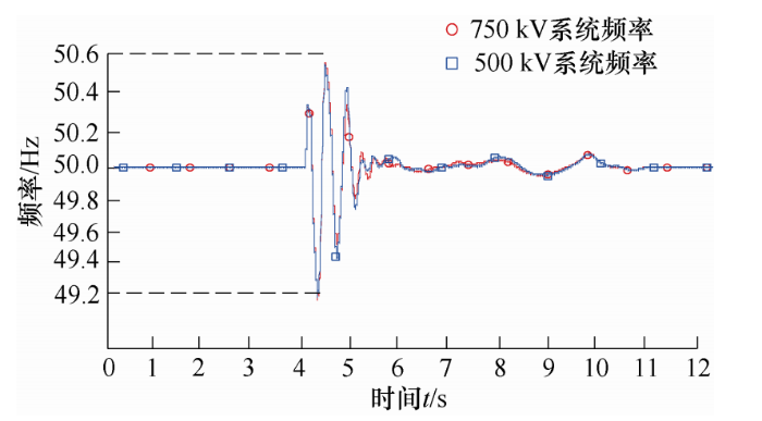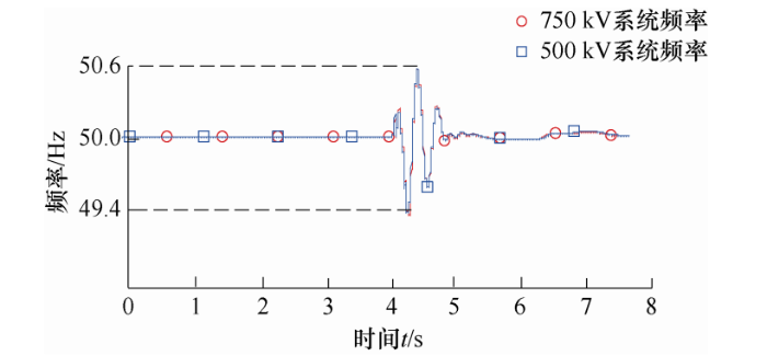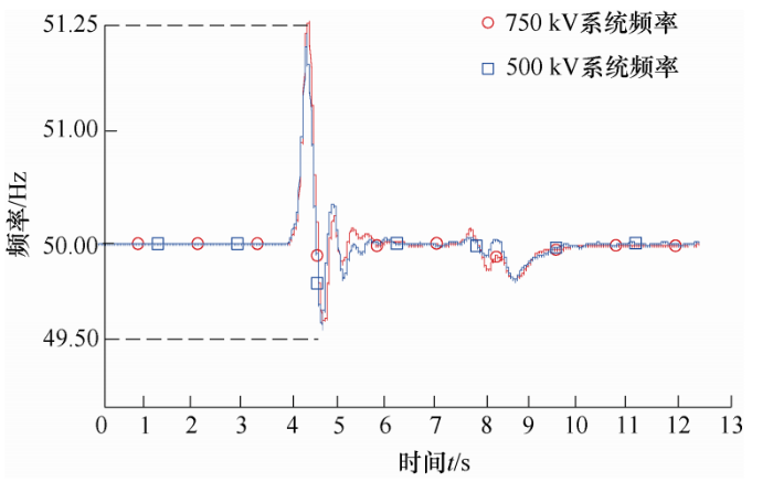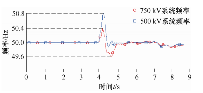 由仿真图9、10可知,当输送距离为300 km时,对交直流并联输电系统而言,当直流系统发生故障时,750 kV系统与500 kV系统频率波动幅度基本一致,非并联系统输电频率波动范围,取决于交流系统电压等级,当电压等级越高时,其频率稳定性越好。