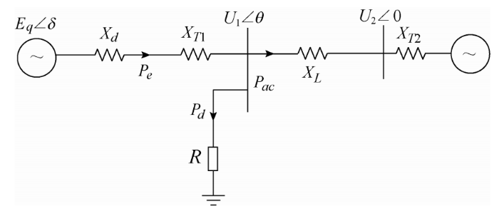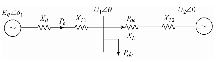 式中,$\Delta P_{ac}$为直流系统故障时的功率变化率;$\Delta U_{1}$为送端系统电压变化量;$\Delta\delta_{1}$为直流系统故障时功角变化量;$\Delta\theta$为U1与U2之间相角变化量;$\Delta f_{ac}$为交流系统频率变化量;K为斜率。由式(12)可知,对非并联结构交直流混联输电系统而言,频率稳定性与交流输电系统电压等级、输电距离密切相关。由式(13)可知,当交流系统电压等级较低时,交流系统极限功率Pacm值较小,则系统抗扰动能力较差,直流系统发生故障时频率波动较严重。由式(14)可知,非并联运行的交直流混联系统,线路输送距离越长,交流系统频率稳定性越差。