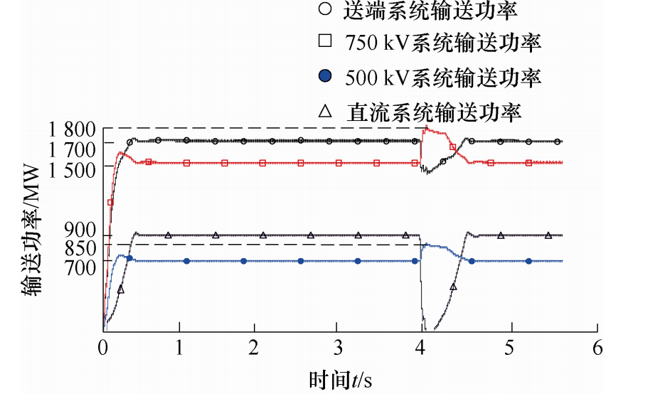 500 km并联输电系统各输电通道有功功率变化曲线