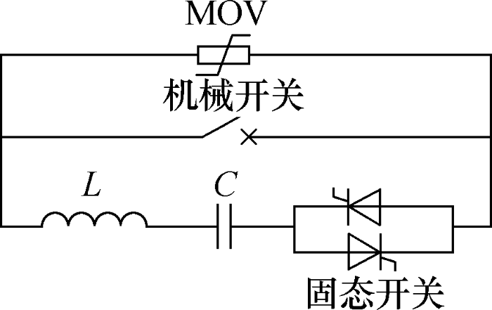 传统的机械式直流断路器,如图2所示,一般采用机械开关并联电感电容振荡电路和能量吸收电路的方法,利用预充电电容与电感谐振产生反向谐振电流,与机械开关上的电流相抵消,产生电流人工过零点,实现熄弧和开断直流电流的功能。在正常运行时,机械开关闭合,固态开关断开,电流流经机械开关。故障时,机械开关断开燃弧,导通固态开关,振荡电容C与振荡电感L产生的振荡电流被叠加到机械开关支路。分闸过程完成,断开固态开关。