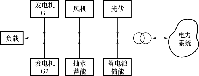 在分析电力生产和储存的模型中,为了进行模拟,本文定义了一个微电网系统,该系统由光伏发电厂、风机、小型抽水蓄能系统、电能储存(Electric energy storage,EES)、柴油和燃气发电机组成,系统模型如图1所示。