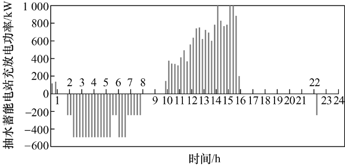 本文所提出的微电网模型中的抽水蓄能电站有一个大的下水库,代表无限量的水,而上水库的容量为4 000 kWh。上水库不允许进一步排放的最小能量为200 kWh。四台250 kW的水泵用来抽水。电能是通过涡轮机从上水库放水产生的, 输出功率在400 kW到1 000 kW之间。抽水蓄能电站的效率为80%。