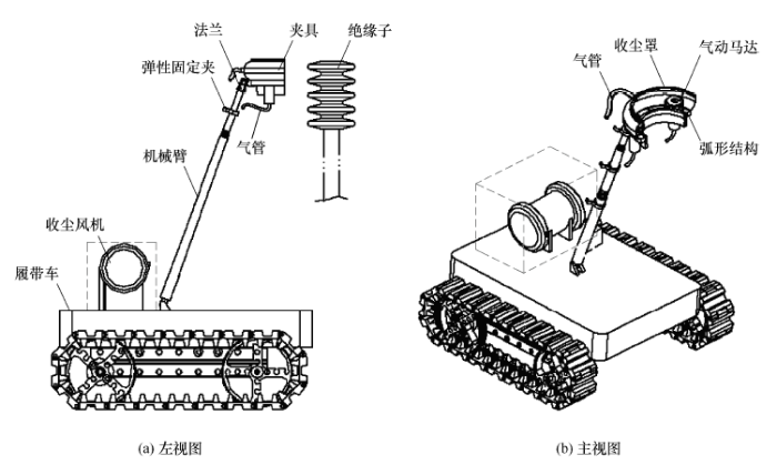 工业的飞速增长进一步造成气候恶劣变化,大气中污秽混合物严重威胁着高压输电线路的绝缘子安全稳定运行[1,2]。污闪跳闸一直是影响电力系统安全输电的问题之一[3],绝缘子在其中通常起着重要作用,它的质量好坏影响到整个系统的可靠运行[4,5]。一旦发生污闪事故,则波及面大、持续时间长[6],并且经济损失十分巨大[7],严重情况下,会发生电力人身安全事故[8]。污闪跳闸已经成为影响电力系统安全经济稳定运行的主要因素之一[9]。随着科技的发展,高压绝缘子清扫装置研制智能化的程度越来越高,国内外涌现出了大量的研究成果[10]。自20世纪70年代起,法国电力公司(Electricite De France,EDF)对63~400 kV输电网络的机器人维护可行性进行了研究[11];日本工程师Nakashima等[12]针对自动机器人技术在线路维修工作中的应用进行了研究,根据绝缘子的形状和尺寸的大小,在绝缘子周围安装管道和喷孔,通过对水进行加压流入管道和喷孔实现对绝缘子的水冲洗。Murali等[13]利用神经网络的高模型复杂性和增强学习(Reinforcement learning,RL)算法的无模型性为许多机器人应用程序提供了一个理想的组合,对机器人操作提供了便利。文献[14]对机器人轨迹规划的动态规划方法进行了研究。德国某公司[15]设计出了一款灵活性较好的高压水冲洗装置,能够实现在线路停电的条件下对绝缘子进行冲洗。文献[16]采用绝缘子带电清扫机器人清扫绝缘子,可以有效地清除绝缘子表面的污秽,防止污闪事故的发生。文献[17]针对500 kV超高压交流输电线路悬垂绝缘子串的环境特点和双伞裙瓷质盘形悬式绝缘子带电清扫任务需求,提出了一种新型悬垂绝缘子带电清扫机器人机构。文献[18]介绍一种便携式室外专用绝缘子串灰尘清扫器,该清扫器能够根据被擦洗设备形状快速完成擦洗任务,自由快速切换近距擦洗和远距擦洗两种模式而无需改变操作人员所在位置,擦洗角度任意可调,而且能够在停电状态下水洗擦掉顽固污渍,有效解决了高压设备绝缘子清扫问题。现阶段,“爬、扫、涂”的方式被广泛地运用在我国电力设备外绝缘维护中[19]。为解决我国电力设备外绝缘维护“爬、扫、涂”方式的缺点,本文对变电站支柱式绝缘子清扫系统进行了设计与研究。