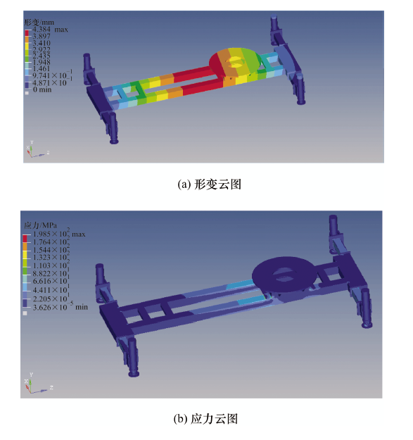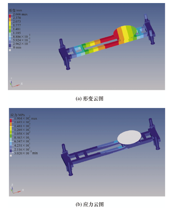 仿真结果数据显示,机械臂的底部支架液压腿在不伸长和伸至最长的状态下,底部支架受到的最大应力均在支架承受范围内,符合技术指标,满足设计要求,本文中夹具所承受的重量小于300 kg。所以满足此款底座设计要求,可以实现多方面的用途。