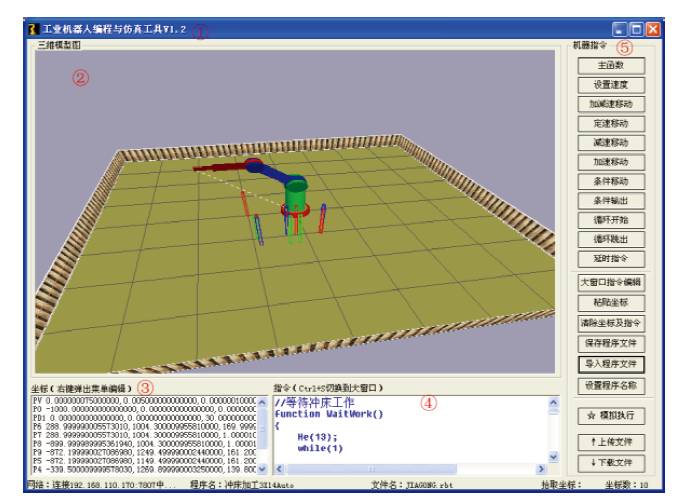 “工业机械臂编程与仿真工具”是用来编写机械臂具体动作的程序,可以实现坐标点获取、机器指令编程、程序文件上传和下载,各种加工程序上传到控制服务器后实现机械臂的指令编程。同时,该软件还可以虚拟仿真运行所编写的程序动作。在计算机上安装好该程序,编程与仿真工具初主面如图12所示。在这个界面中可以看到有五个区域组成。① 程序名称及版本号;② 机械臂位置关系及坐标点显示,机械臂动作虚拟运行;③ 坐标接收及坐标点定义;④ 指令编程区;⑤ 机器指令控制按钮。区域②是3D虚拟仿真画面区。单独取一个控制器通电后放在计算机旁边,用网线将计算机和控制器连接后,将编写动作程序下载到控制器,即可虚拟运行该程序。该运行方式突破了常规调试方法的弊端,因为在初次编写动作程序时,很可能出现动作不合理(比如伸太高或太远会撞到周围的东西或者写错程序导致机械臂运动到未知位置进而伤到人),在虚拟3D动画中可以及时发现程序的错误,不会造成事故的发生。区域③左下角的区域是一个定义坐标点的窗口,相当于一个变量的赋值声明,例如P0点指的就是机械臂的原始位置点,也叫原点。后面的6个数据代表的是机械臂腕部法兰盘中心(PCT点)点坐标系在机械臂坐标系下的位置X、Y、Z与姿态a3、a4、a5。在示教时可以在任何一点停下保存该点并命名,保存的点就会在这个窗口出现。在编程时可以直接调用该点,比如执行LineMove(P0),无论机械臂在哪个位置,都会直线运动到P0点。区域⑤是快捷按钮区,包括上传下载、模拟执行。
