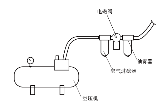 空压风系统如图2所示,包括空压机、空气过滤器、电磁阀和油雾器。空气过滤器的作用是对空压机输送的空压风进行干燥处理;电磁阀的作用是调节空压风的气压从而实现对气动马达转速的调节;油雾器作用是对空压风进行润滑处理保证气动马达的快速转动。