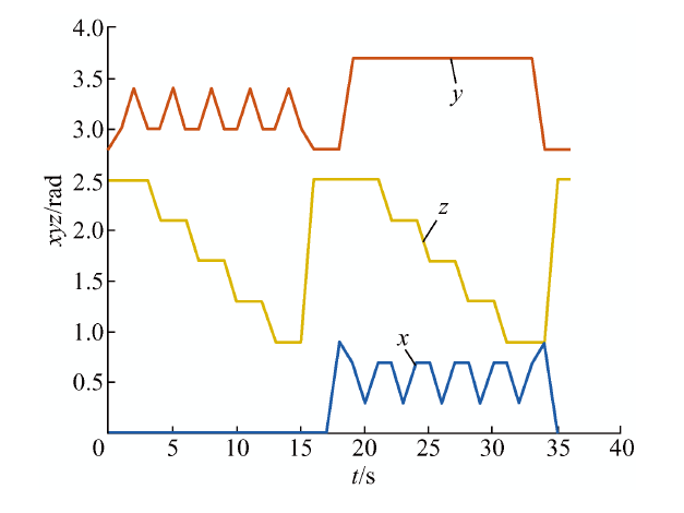 使用Matlab编写代码求得机械臂逆解与机械臂工具箱自带逆解算法进行逆解得到了相同的逆解结果,逆解结果(六个关节的角度值)如图8所示,单位为弧度,证明了编写代码进行求逆解的正确性,可以进行工业生产。
