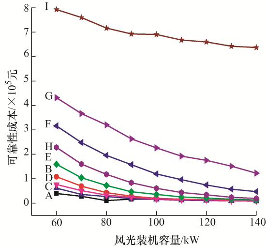 图9 不同风/光比例及装机容量对可靠性成本的影响 |