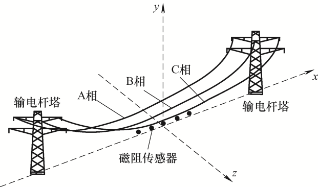 通过磁场传感的杆塔监测模式,首先需要确定架空输电线的磁场方程,如图1所示是典型的输电塔之间的高压传输线示意图,A、B、C三相输电线周围的磁场分布受悬链线形状及其相对位置的影响。测试模型简化为三相传输线的下垂程度相同,通过叠加原理即可计算三相传输线产生的磁通密度。